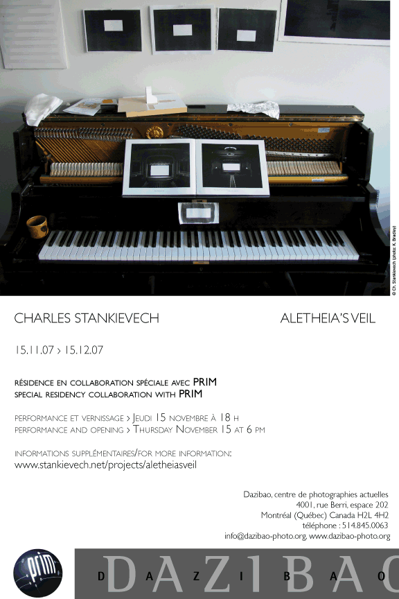 Aletheia's Veil Artist Statement Dazibao . centre de photographies actuelles Invite . press release [fr] . press release [en] Images Performance . À la recherche du temps perdu Performance . Radiance (soundtrack for a silent cinema) Thank you