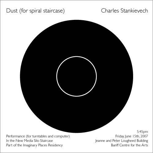 Banff New Media Institute Limiting source sounds to the last groove of the record, Dust evolves out of the manufactured silence of the recording medium. Dust particles, the grain of the shellac, and the trace of the cutting stylus uncover the foundation for a composition that explores the extreme ends of noise: from the delicate to the abrupt. Custom software routes, processes and modulates the record loops into a field of textures that range from micro-constellations to deep resonant tones. Closing the Imaginary Place's Open Studio Day, this particular version of the piece is performed in the Banff New Media Institute's cement silo staircase. While the performance starts at the bottom of the silo, the audience is free to spiral up and down the 4 stories to experience variations in the soundfield. view poster for performance |