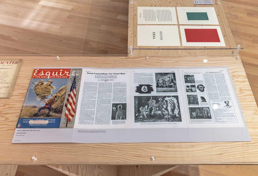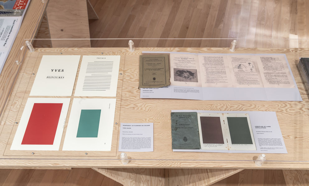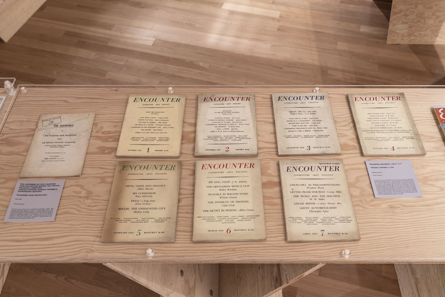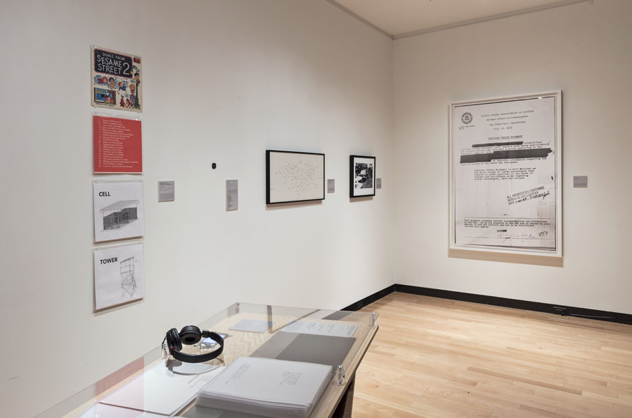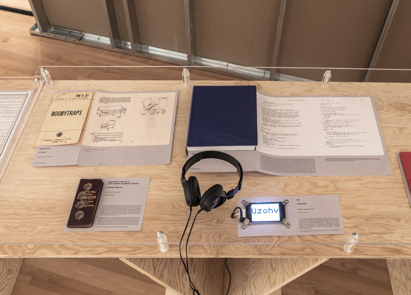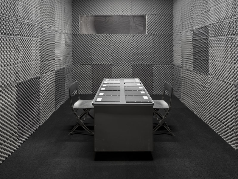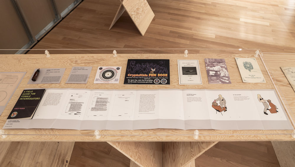 Entrance to the exhibition leads into a dead end reconstruction of a CIA interrogation room, functioning as the reading room for the CounterIntelligence exhibition. Visitors can unbeknowngst be observed via a one way mirror from other visitors already inside the exhibition. The installation was called the Interroum (a portmanteau of Interrgation Room and the Proun Room). The Interroun, Charles Stankievech, 2014 Installation View (Dossiers of CIA, lt. Col. Jim Channon, DBI Architects, Gadda Administration, Hedy lamarr + George Antheil, El lissitzky, Major vera Michael,Edward Snowden, Installation View Installation View (Abbas Ahkavan, Arthur Erickson, Eyal Weizman, Adam Broomberg + Oliver Chanarin, Gordon Matta-Clark) Installation View Installation View (centre: Robert Smithson Nonsite and Center for Land Use Interpretation) Installation View (Richard Mosse) Installation View (Bill Burns, Casio Watch F-91W, Mark Lombardi), Simon Menner, Dana Claxton) Installation View (Bill Burns, Casio Watch F-91W, Mark Lombardi) Installation View (Steve Rowell, Amir yatziv, An-My Le)̂ Installation View (Gordon Matte Clark Split, Icelandic Spar Crystel with Thomas Pynchon passage, Robert Smithson Nonsite) Installation View (Wadsworth Dazzle Ship, Roland Penrose Camouflage Photo, Lee Millar Vogue Camouflage shoot, Canadian Military Digital Camouflage Textile) Installation View (Rueben's Letter and Thayer Book) Installation View (Yves Klein Edition, Canadian Military Manual WW2, British Camouflage Manual WW2) Installation View (Salvidor Dali) Installation View (Iraqi Delegation Report to UN on Palestine, Encounter Journal Issues 1-7) Installation View (LSD, NSA booklets, Coco Fusco Book) Installation View (Alfonso Laurencic) Installation View (Wittgenstein's House Key, Eyal Weizman, Paul Virilio, Bomb Shelter didactic) Installation View (US Army, Phil Zimmermann, George Conklin, Sang Mun) Installation View (Radical Software Iss. 3: Paul Ryan and Gregory Bateson) Installation Views (Marcel Broodthaers, Charles Stankievech, Mark Lombardi, Lucy Lippard, Jan Dibbets, Douglas Huebler, Joseph Kosuth) Installation Views (Ed Ruscha, Donald Judd, Scientific American) Installation View (Charles Stankievech & Joshua Simon, Mel Bochner, Dan Graham) Installation View (Charles Stankievech and Fabian Reimann) Installation View Installation Views (Radio Program - See Catalogue for full list of work, Tamas St.Turba, Trevor Paglen) Installation View (Wikileaks and Sites: Non, Black, Specific) Installation View (US Army and Wikileaks) Installation View (Harun Farocki, Hizbollah, US Army) ^TOP © Charles Stankievech