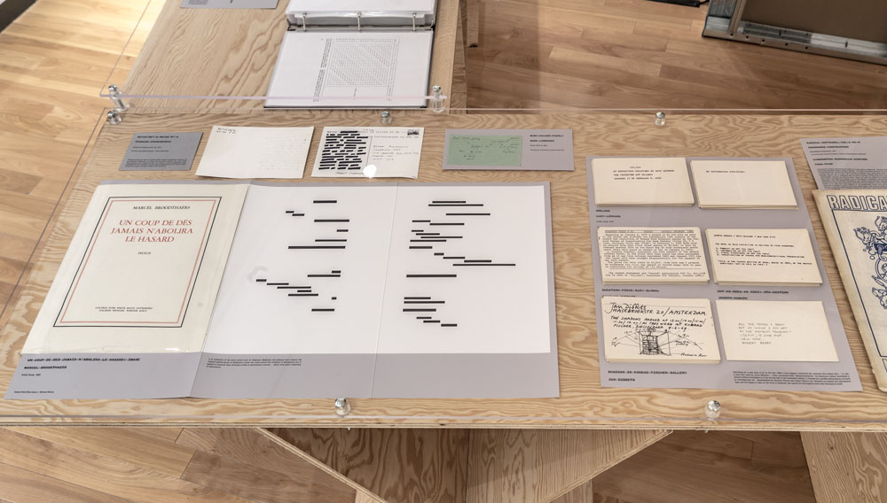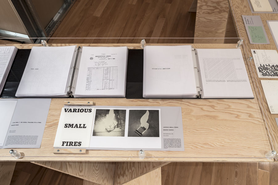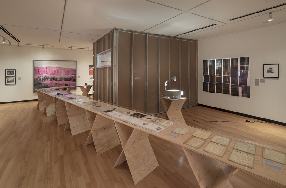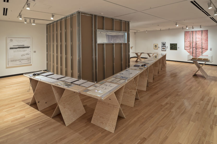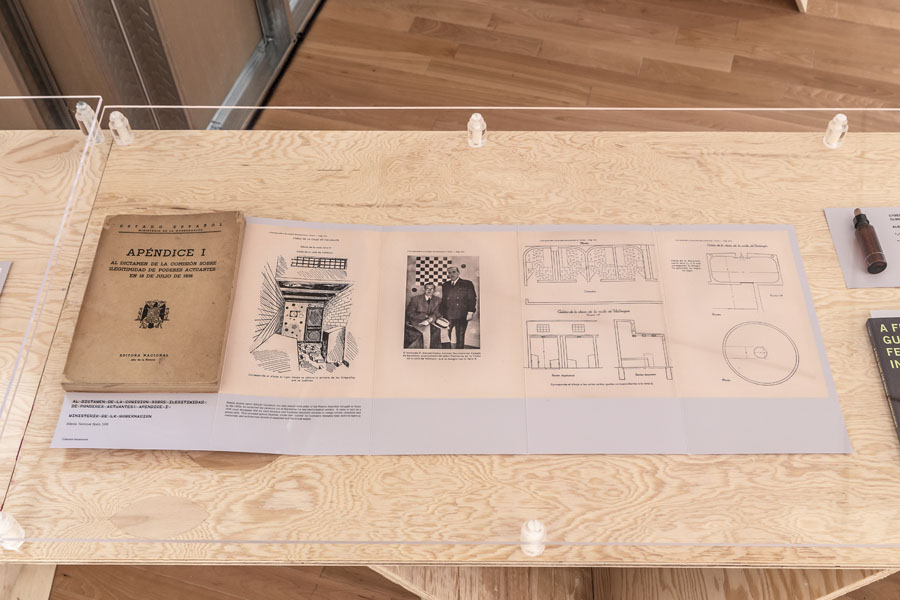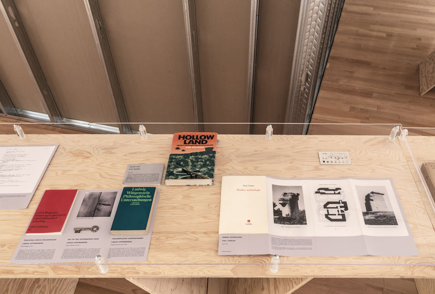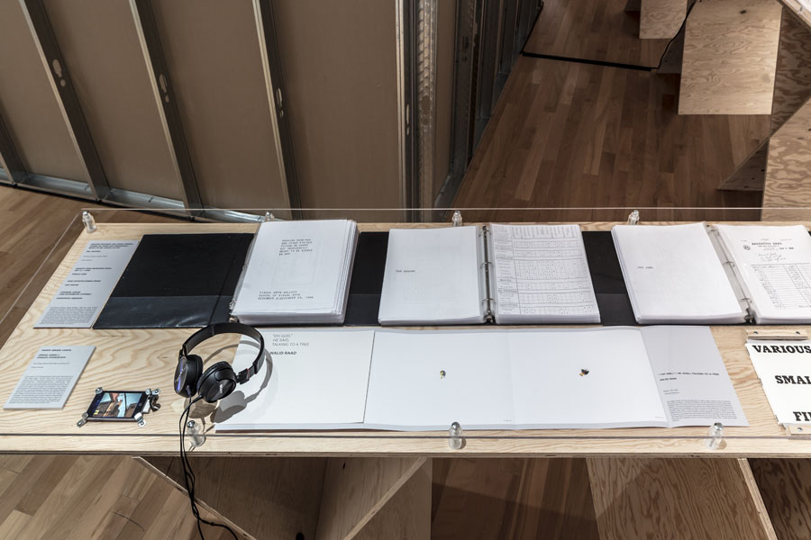 Entrance to the exhibition leads into a dead end reconstruction of a CIA interrogation room, functioning as the reading room for the CounterIntelligence exhibition. Visitors can unbeknowngst be observed via a one way mirror from other visitors already inside the exhibition. The installation was called the Interroum (a portmanteau of Interrgation Room and the Proun Room). The Interroun, Charles Stankievech, 2014 Installation View (Dossiers of CIA, lt. Col. Jim Channon, DBI Architects, Gadda Administration, Hedy lamarr + George Antheil, El lissitzky, Major vera Michael,Edward Snowden, Installation View Installation View (Abbas Ahkavan, Arthur Erickson, Eyal Weizman, Adam Broomberg + Oliver Chanarin, Gordon Matta-Clark) Installation View Installation View (centre: Robert Smithson Nonsite and Center for Land Use Interpretation) Installation View (Richard Mosse) Installation View (Bill Burns, Casio Watch F-91W, Mark Lombardi), Simon Menner, Dana Claxton) Installation View (Bill Burns, Casio Watch F-91W, Mark Lombardi) Installation View (Steve Rowell, Amir yatziv, An-My Le)̂ Installation View (Gordon Matte Clark Split, Icelandic Spar Crystel with Thomas Pynchon passage, Robert Smithson Nonsite) Installation View (Wadsworth Dazzle Ship, Roland Penrose Camouflage Photo, Lee Millar Vogue Camouflage shoot, Canadian Military Digital Camouflage Textile) Installation View (Rueben's Letter and Thayer Book) Installation View (Yves Klein Edition, Canadian Military Manual WW2, British Camouflage Manual WW2) Installation View (Salvidor Dali) Installation View (Iraqi Delegation Report to UN on Palestine, Encounter Journal Issues 1-7) Installation View (LSD, NSA booklets, Coco Fusco Book) Installation View (Alfonso Laurencic) Installation View (Wittgenstein's House Key, Eyal Weizman, Paul Virilio, Bomb Shelter didactic) Installation View (US Army, Phil Zimmermann, George Conklin, Sang Mun) Installation View (Radical Software Iss. 3: Paul Ryan and Gregory Bateson) Installation Views (Marcel Broodthaers, Charles Stankievech, Mark Lombardi, Lucy Lippard, Jan Dibbets, Douglas Huebler, Joseph Kosuth) Installation Views (Ed Ruscha, Donald Judd, Scientific American) Installation View (Charles Stankievech & Joshua Simon, Mel Bochner, Dan Graham) Installation View (Charles Stankievech and Fabian Reimann) Installation View Installation Views (Radio Program - See Catalogue for full list of work, Tamas St.Turba, Trevor Paglen) Installation View (Wikileaks and Sites: Non, Black, Specific) Installation View (US Army and Wikileaks) Installation View (Harun Farocki, Hizbollah, US Army) ^TOP © Charles Stankievech