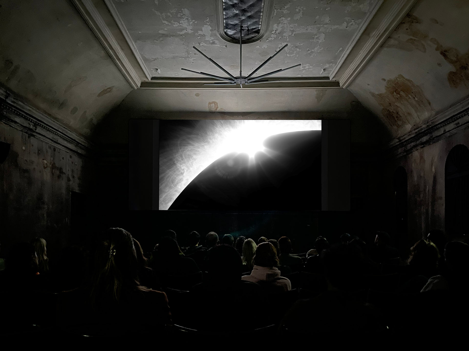 «A Shroud Woven of Solar Threads» is a film by Ala Roushan & Charles Stankievech that connects the ancient Sun worship of Mitra–coinciding with the climate crises 4200 years ago-–with the contemporary concept of solar geoengineering. Revolving around a subterranean ritual, documenting the oldest surviving Mithraic temple in Iran, a collective chant invokes the deity Mitra's protection from the Sun. The script is a speculative reconstruction of the Proto-Indo-Iranian (PII) language from a period that lacks written traces. Using a comparative linguistic methodology, as developed by Prof. Toledo, the script was further extrapolated using a Large Language Model (a generative AI technique) to construct the ritual. As the narrative develops, the surface of the cavernous temple disintegrates into a particle cloud as the ancient language morphs into a futuristic computer script suggesting a protocol for solar geoengineering.